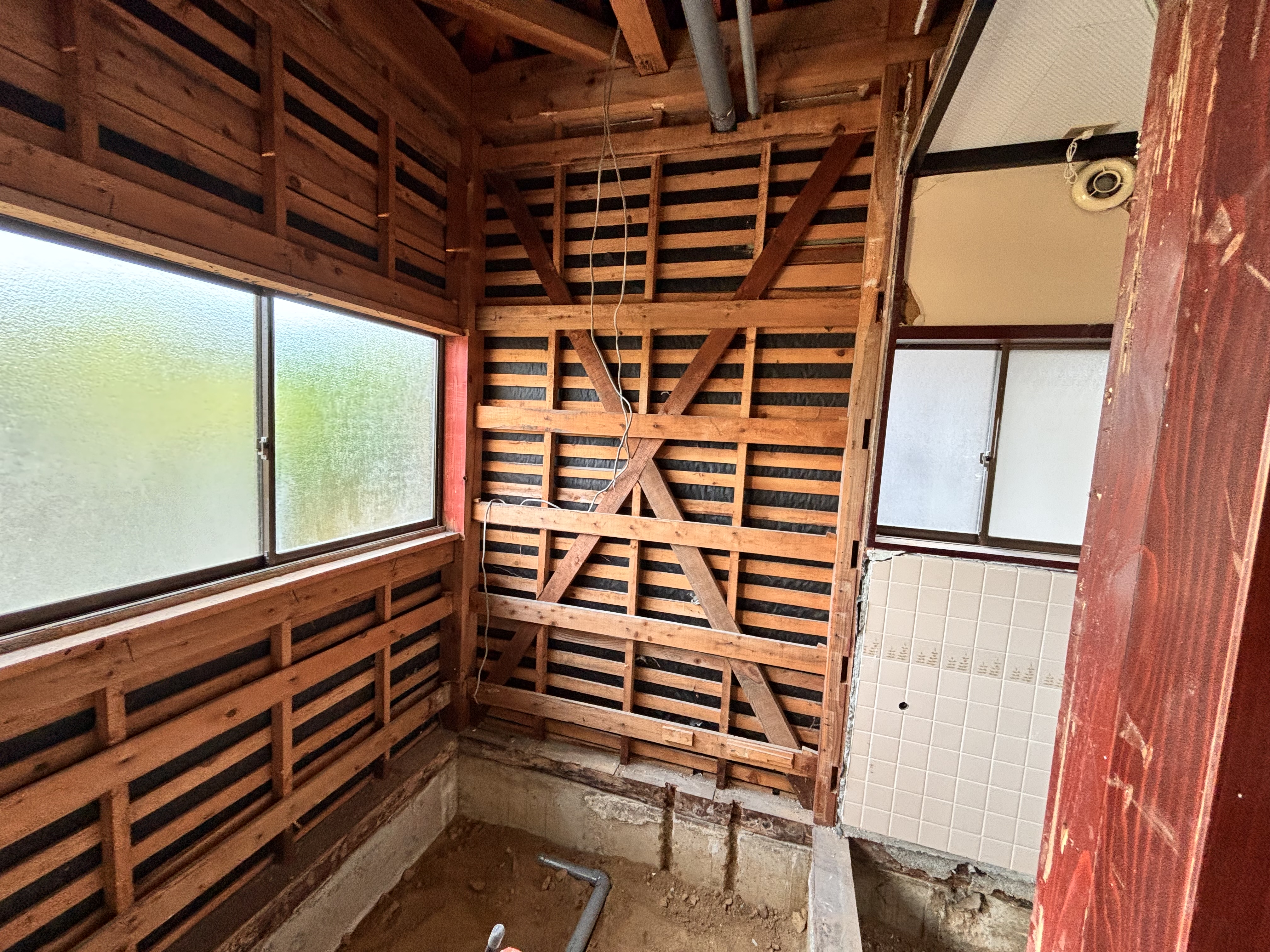 すぐ右横はトイレでして、トイレとの間仕切も補強する為に間仕切壁は全解体しました。