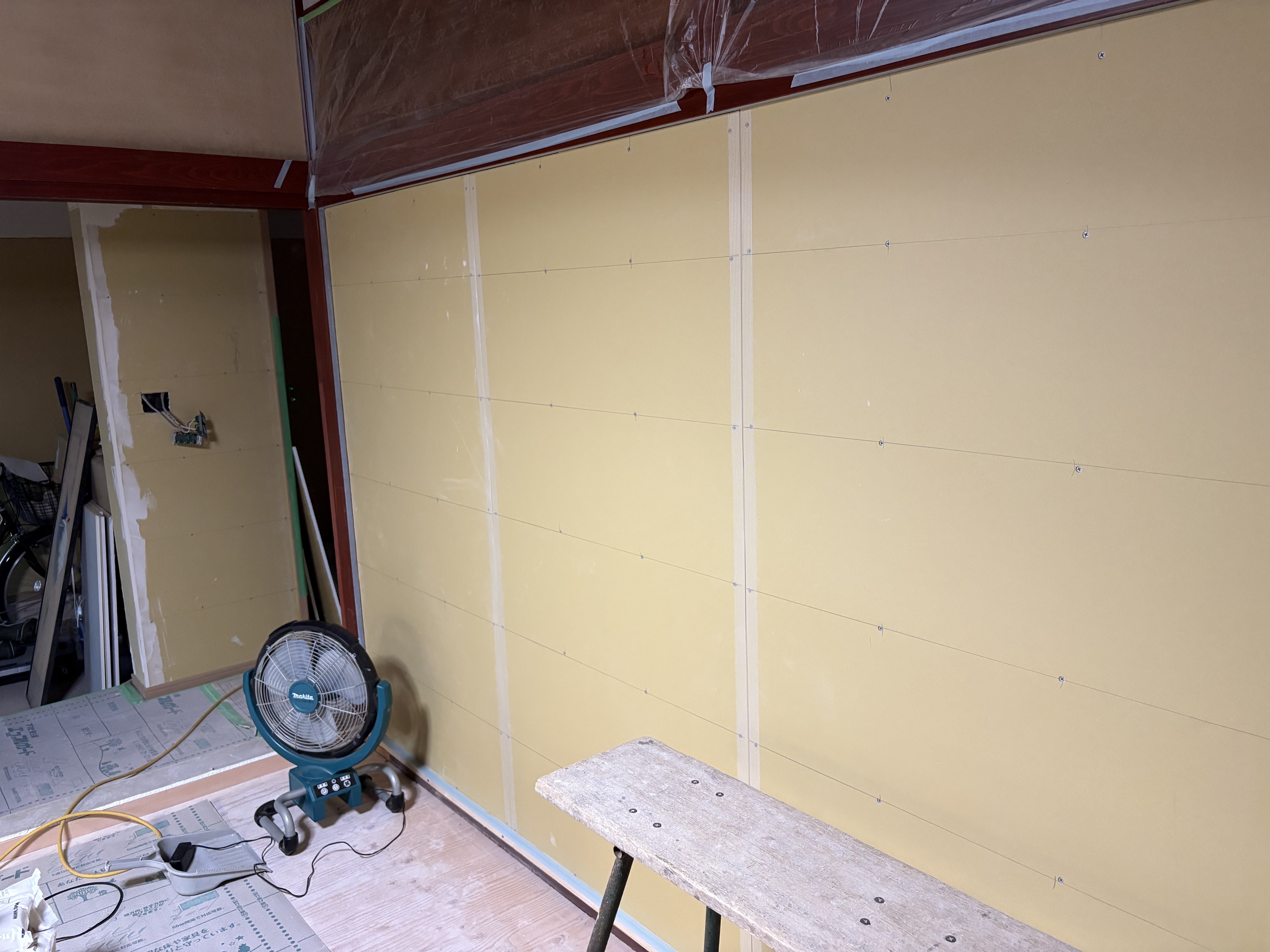 ボード継ぎ目に寒冷紗を施行したのがわかる状況ですね。