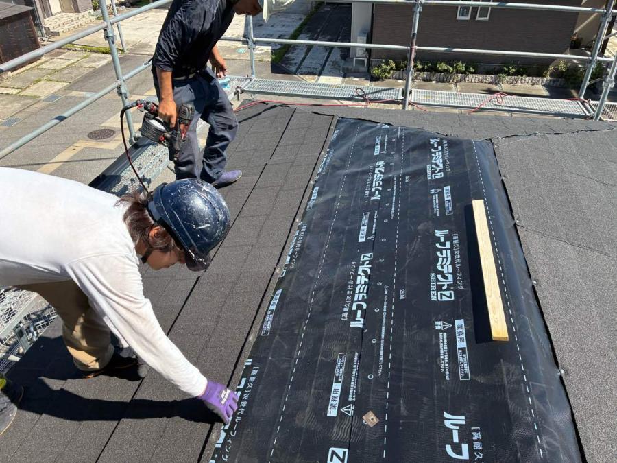 ルーフィングを施工させていただき作業が進んでいきます。