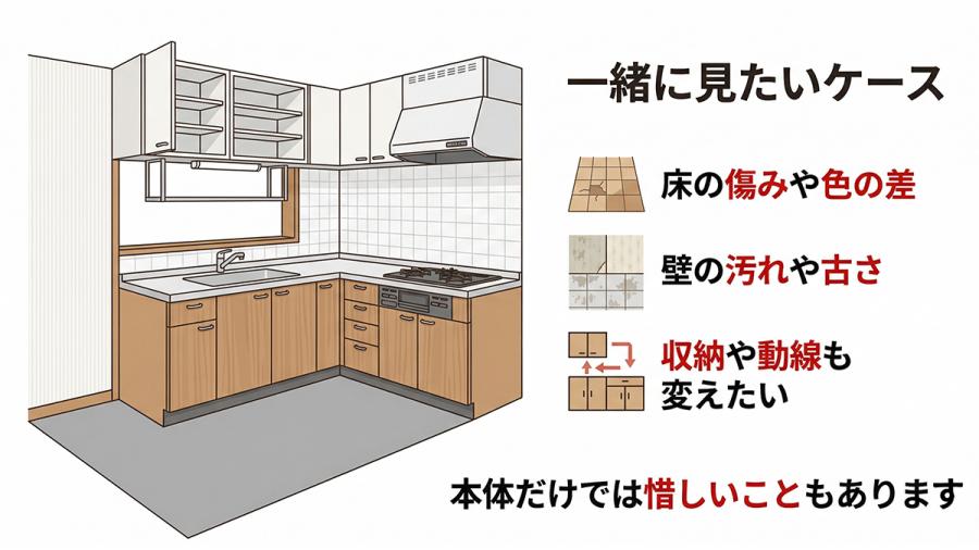 ただ、床の傷みや壁の汚れ、収納や動線の不便が重なっている場合は、本体だけ替えると周りとの差が気になりやすくなります。