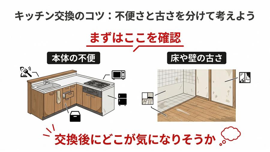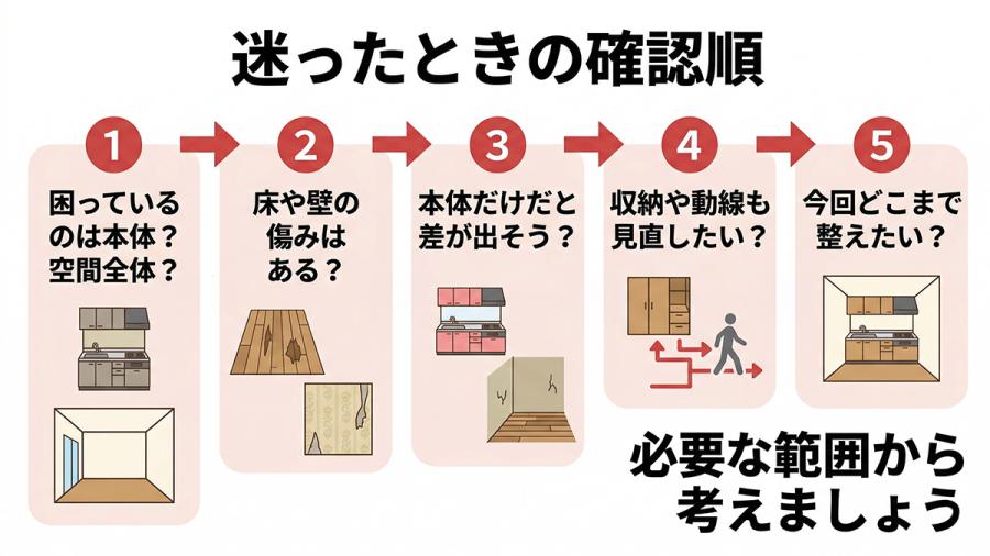 まず確認したいのは、困っていることがキッチン本体にあるのか、それとも空間全体に広がっているのかです。