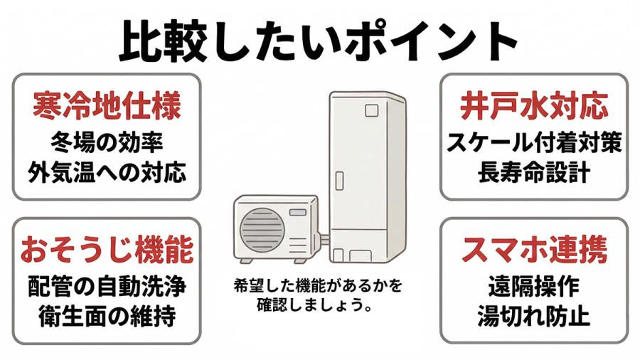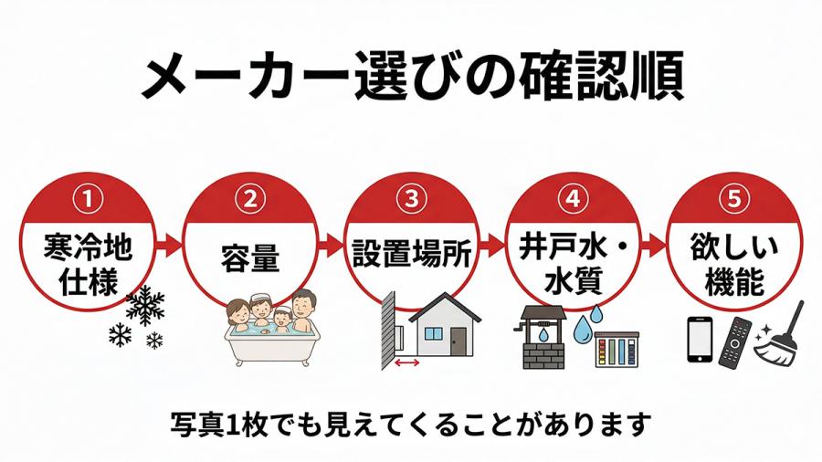 たとえば、冬場の使い方を重視するなら寒冷地仕様を先に確認したいですし、井戸水を使っているご家庭では対応機種かどうかを早めにご確認ください。
