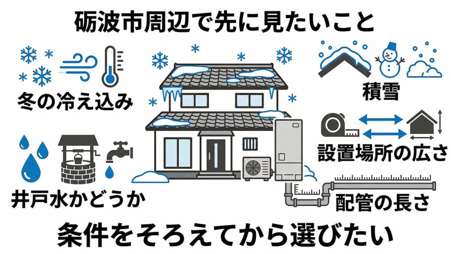 砺波市周辺で考えるなら、冬の冷え込み、積雪、設置場所まわりの余裕、水質の条件まで一緒に見ておきたいところです。