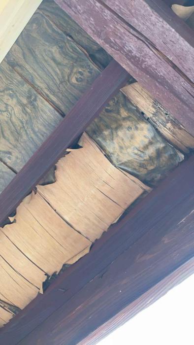 今回改修工事をさせてもらった現場での話です。現地調査時では気づけなかった軒天裏のベニヤのめくれがありました。足場を立て、軒天・破風の点検を行った際に発覚しました。処置として、お客様へベニヤを張りその上から塗装をすることでご納得いただけました。