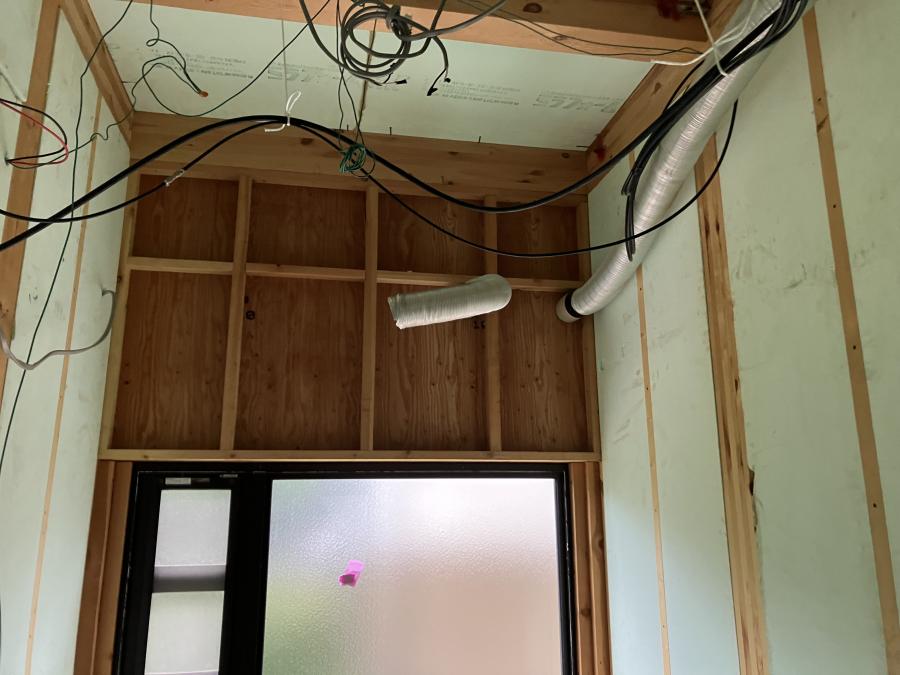 見えない部分こそ、リフォームの要です。 既存の浴室を丁寧に解体し、壁の内部や配管の状態を隅々までチェックします。この施工中の写真にあるように、普段は見えない天井裏の換気ダクトや電気配線も、新しいシステムバスに合わせて最適化していきます。
